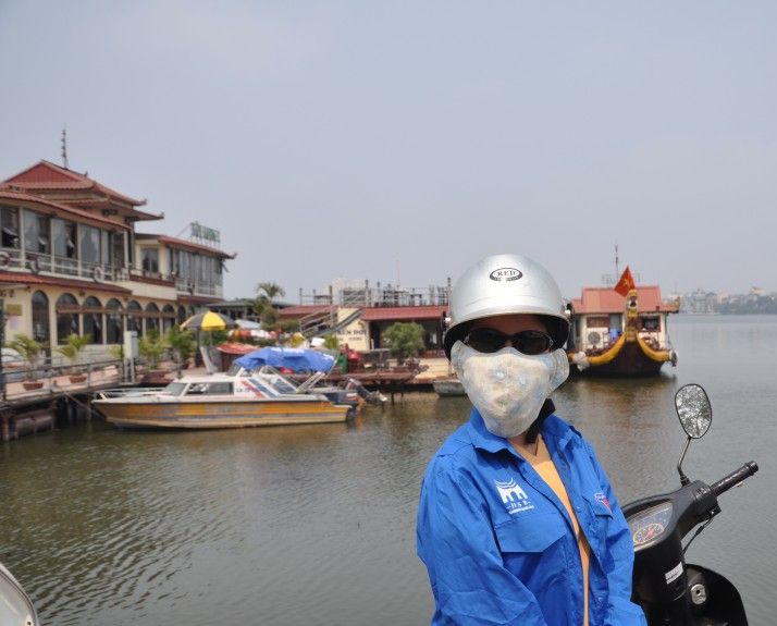 そんなバイクがたくさん走っているのと、やはり工場が多いからでしょうか、ベトナムの大気汚染はなかなかひどいものがあります。1日、バイクで外を周ったら、鼻の中黒くなりますよーw シャワーの後に鼻の中をティッシュで掃除すると、ティッシュが軽く黒ずむぐらいです! ベトナムの女性は日焼け防止と大気汚染から喉を守るため、かなりの重装備でバイクに乗ります。 こんな感じで・・・