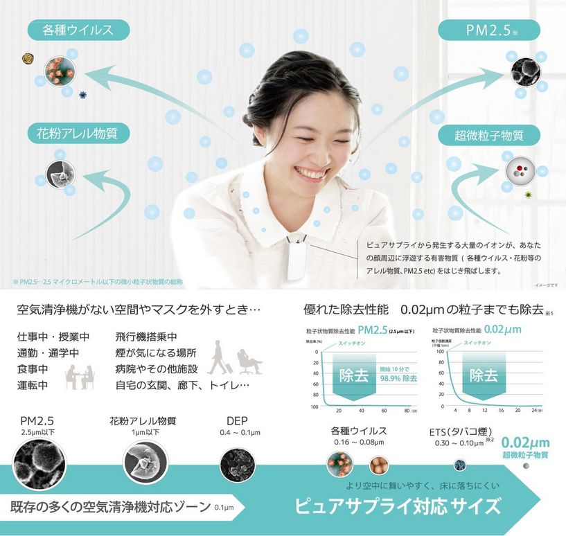 マイナスイオンを自分の顔の付近に発生させて、ほこりやアレルギー物質を体に寄せ付けないという